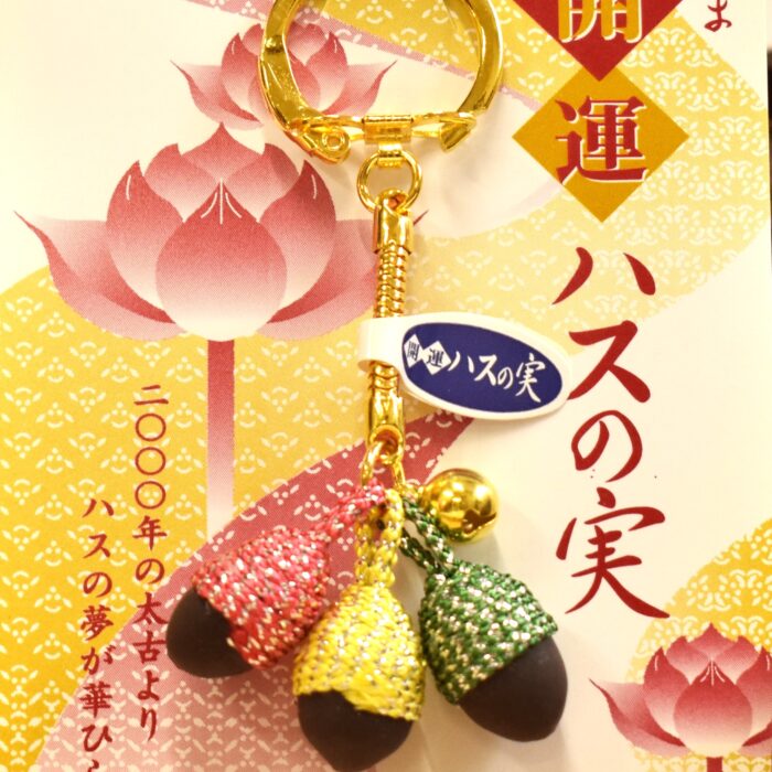 れんこんの産地羽島市ならではの、ハスの実を使った手作りお土産品。羽島市のれんこん畑で採取したハスの実をカラー手芸糸で巻いています。
